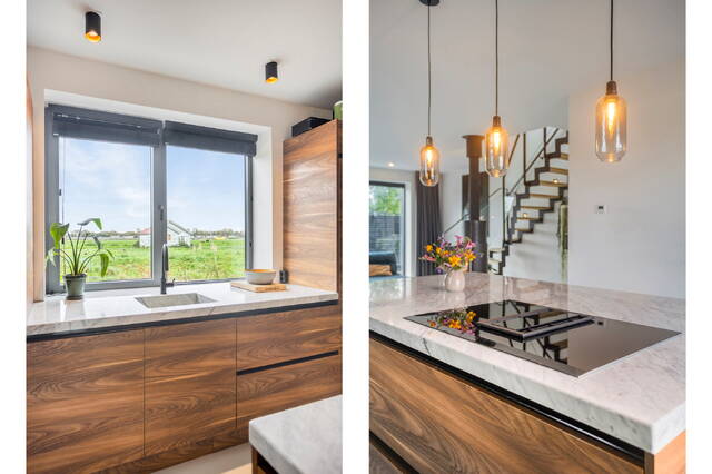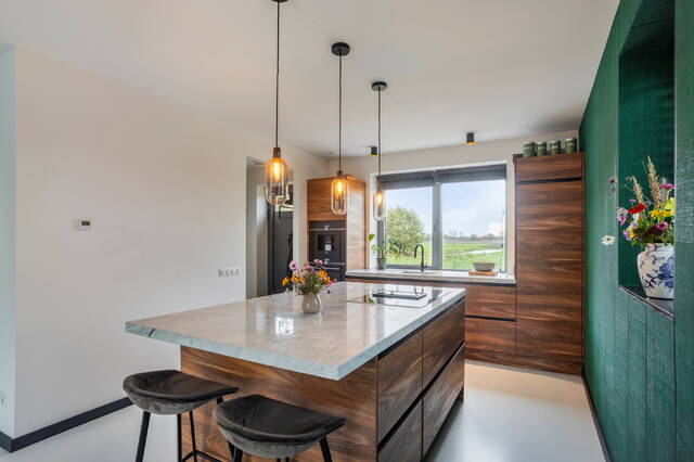 Aan de voorzijde bevindt zich de keuken – een echte blikvanger: tijdloos, strak en van hoge kwaliteit. Het royale kookeiland met barzitje vormt het hart van de ruimte, ideaal voor een gezellig ontbijt of een borrel met vrienden. De keuken is voorzien van een inductiekookplaat met geïntegreerde afzuiging, vaatwasser, oven, ingebouwd koffiezetapparaat, koelkast, vriezer en een luxe marmeren werkblad. Dankzij de open verbinding met de eetruimte ontstaat een sfeervol geheel waar koken, eten en wonen perfect samenkomen.