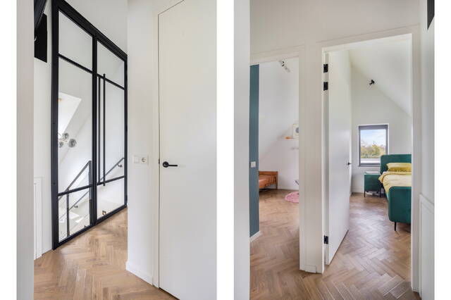 Op de eerste verdieping bevinden zich twee ruime slaapkamers, beide voorzien van dakkapellen aan de voor- en achterzijde, waardoor de kamers veel licht en ruimte bieden. Vanuit elke kamer is er een prachtig uitzicht over het water, de weilanden en het groen rondom de woning, wat bijdraagt aan een gevoel van rust en verbondenheid met de natuur.. De moderne badkamer is voorzien van een inloopdouche, wastafelmeubel en toilet terwijl op de overloop een separate wasruimte aanwezig is.