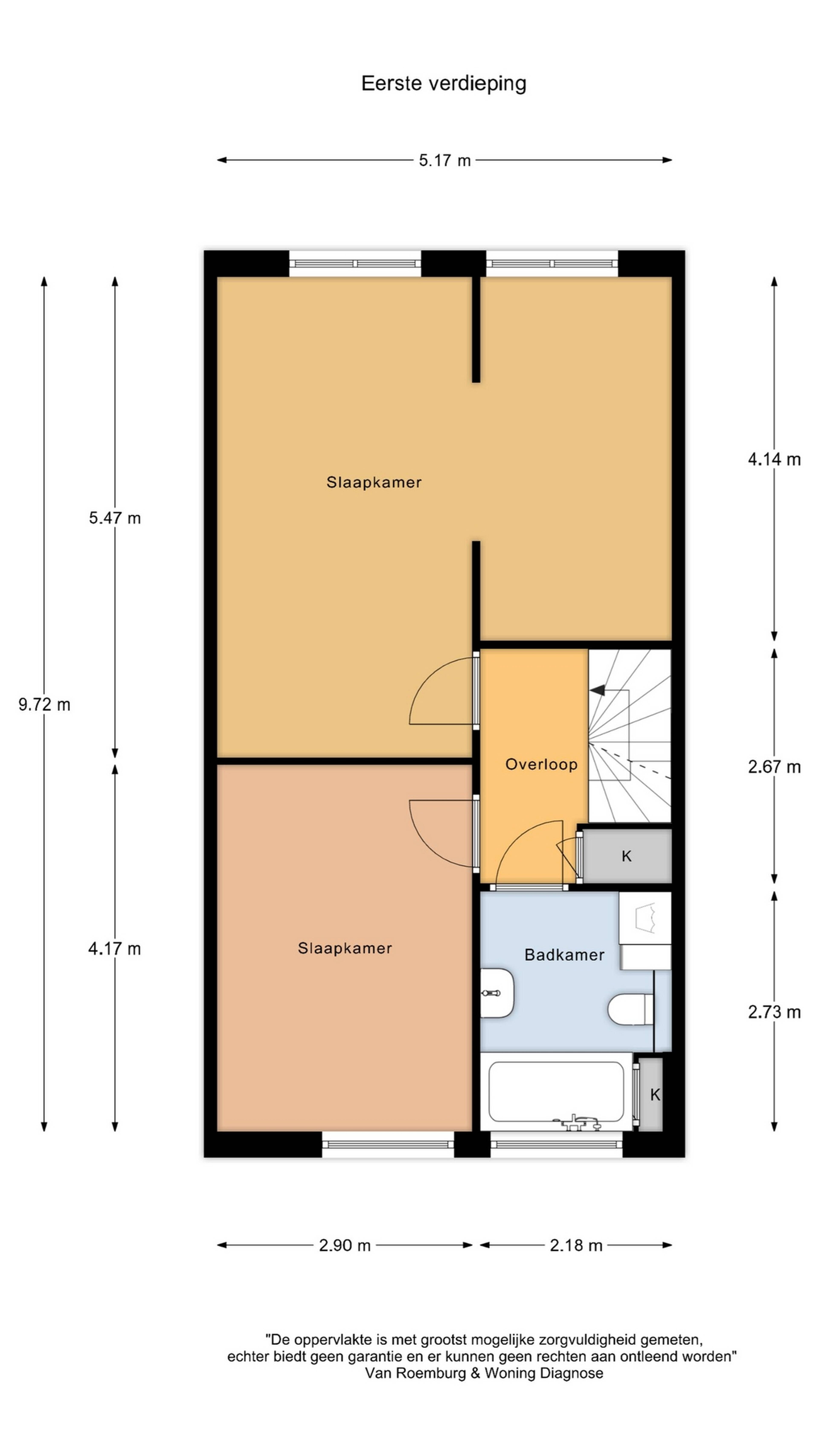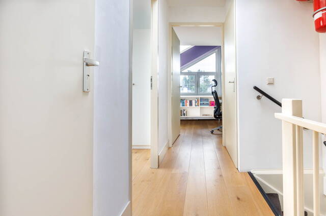 De overloop brengt de 2 ruime slaapkamers (voorheen 3 slaapkamers) samen. De doorgebroken slaapkamer wordt nu gebruikt als walk-in closet. De badkamer heeft een ligbad, wastafel, 2e toilet, wasmachine/drogeraansluiting en mechanische ventilatie. Ook biedt deze veel opbergruimte. De gehele etage is voorzien van eikenhouten lamelparket en heeft een sfeervolle en lichte uitstraling.
