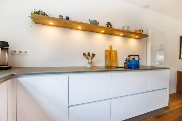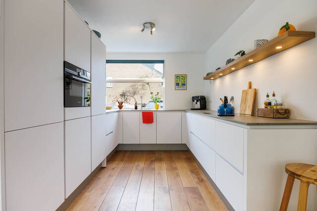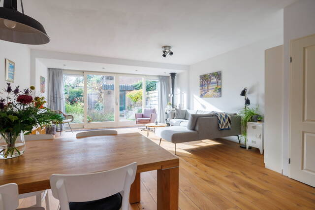Entrance into a spacious hallway with a toilet and sink, and access to the beautiful extended living room. The floor is finished with solid oak parquet. For both warmth and atmosphere, there is a soapstone wood-burning stove that heats the entire space efficiently. The extension features large sliding doors to the south-facing garden, allowing plenty of natural light to fill the room. The generous and modern kitchen is equipped with a Dekton worktop and various built-in appliances, including an induction hob with integrated extractor, a combination steam oven/microwave, a dishwasher, and a fridge-freezer.