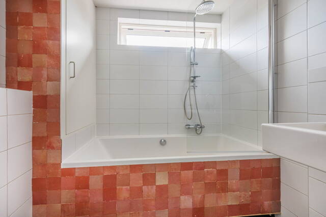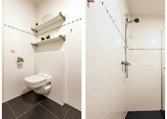 A spacious landing with central heating system, skylight, and access to three rooms and the second large bathroom. This floor features a full-width dormer extension. Both the front and rear rooms are fitted with built-in wardrobes that also serve as radiator covers. The bathroom includes a walk-in shower, washbasin, and third toilet. The same oak engineered parquet continues throughout this floor.