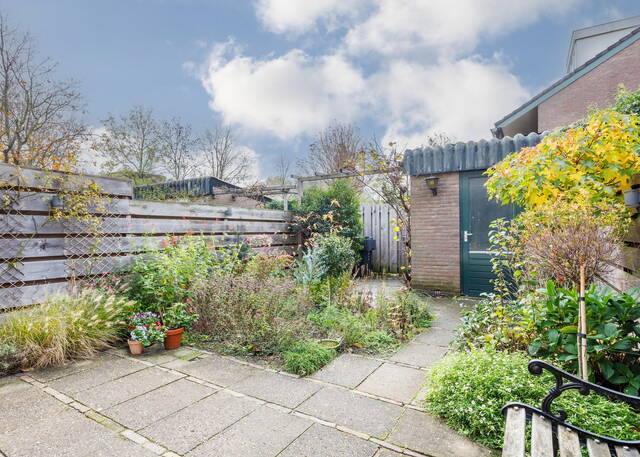 De sfeervolle, op het zuiden gelegen tuin biedt een groot terras, fraaie beplanting en een praktische achterom. Daarnaast heeft de tuin geen tot weinig inkijk van achterburen. U zit echt vrij. De berging is voorzien van elektra en biedt ruimte voor meerdere fietsen. Over de hele breedte van de woonkamer is een elektrisch zonnescherm aanwezig.