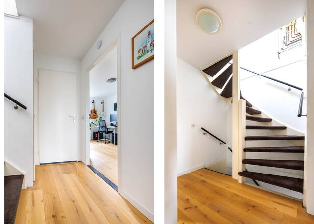The landing connects two spacious bedrooms (previously three). The combined room is currently used as a walk-in closet. The bathroom features a bathtub, washbasin, second toilet, washer/dryer connection, mechanical ventilation, and generous storage space. The entire floor is finished with oak engineered parquet, giving it a warm and light ambiance.