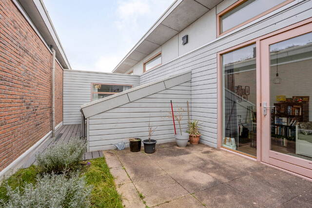 Entrance with hallway and access to the modern toilet and internal storage room. The sunny and atmospheric living room is situated around an inner garden (the patio), which provides plenty of natural light. Modern open kitchen equipped with various built-in appliances including a dishwasher, induction hob, extractor hood, oven, and microwave. In addition, there is a separate fridge with freezer. From the living room, there is access to the well-maintained terrace by the water.