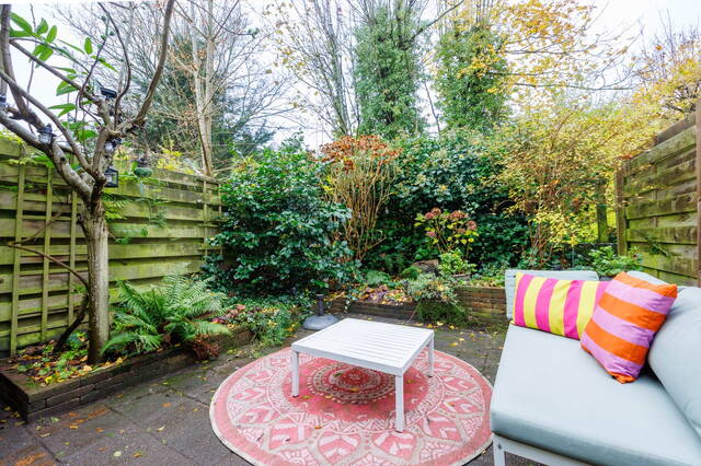 Vanuit de woonkamer bereik je via openslaande deuren de L-vormige achtertuin. Deze heerlijke tuin (NW) biedt volop ruimte voor zowel een eet- als een loungegedeelte. De weelderige beplanting bestaat onder meer uit een grote vijgenboom, druifranken die over de pergola groeien en een blauwe regen. Door de vele bomen op aangrenzende percelen is dit ook in de zomer een fijne, beschutte plek met voldoende schaduw. Het is een groene, sfeervolle stadstuin die veel privacy biedt.