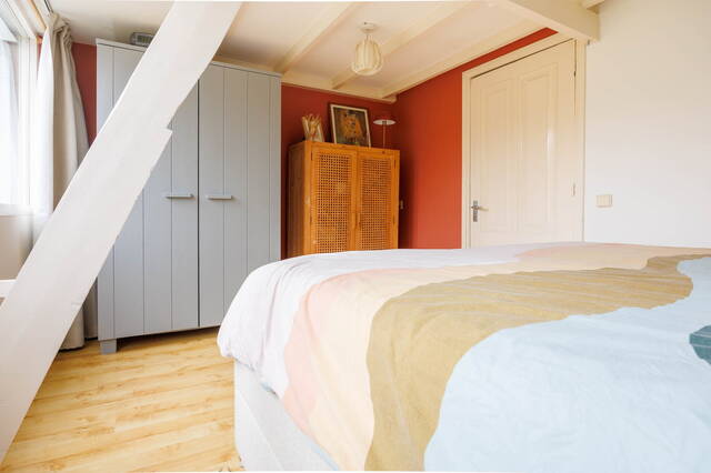Overloop. Een fijne slaapkamer aan de voorzijde, voorzien van origineel balkenplafond en twee ramen, waaronder één Velux dakvenster. De ruime en lichte slaapkamer aan de achterzijde is tevens voorzien van balkenplafond en heeft een deur naar een gezellig dakterras.