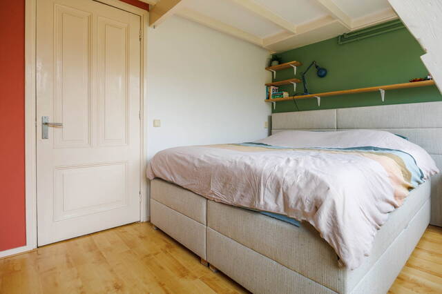 Via een vaste trap bereik je de overloop met ruime bergkast. Aan de achterzijde bevindt zich een ruime, lichte slaapkamer met elektrisch zonnescreen aan de buitenzijde en toegang tot een royale kast + bergruimte waar de CV ketel opstelling bevindt. Ook deze woonlaag is voorzien van een mooie laminaatvloer.