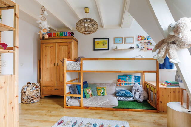 A fixed staircase leads to the landing with a large storage cupboard. At the rear is a spacious, bright bedroom with an electric sun screen on the outside and access to a generous closet + storage area housing the central heating boiler. This floor also features a beautiful laminate floor.