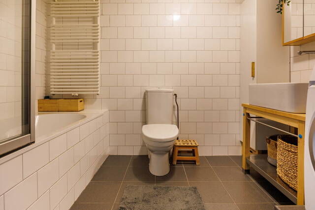 The surprisingly spacious and modern bathroom is beautifully tiled and equipped with a vanity unit, toilet, bathtub with shower and glass screen, washing machine connection, and mechanical ventilation. The entire floor has a stylish laminate finish.