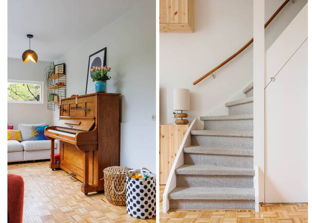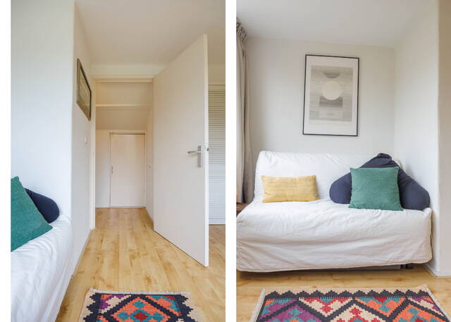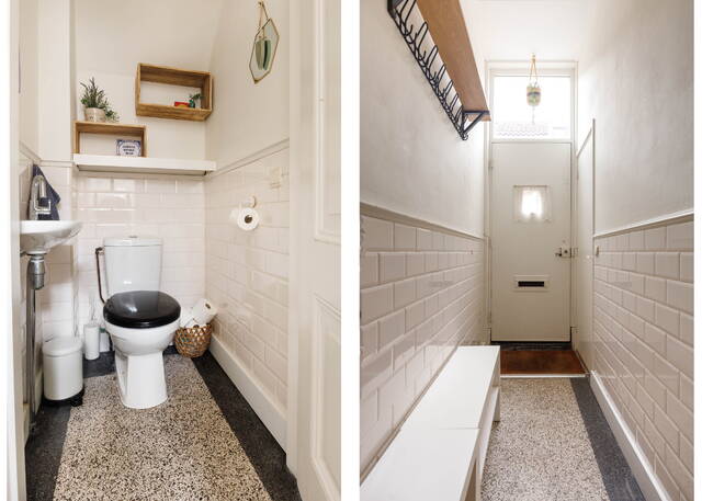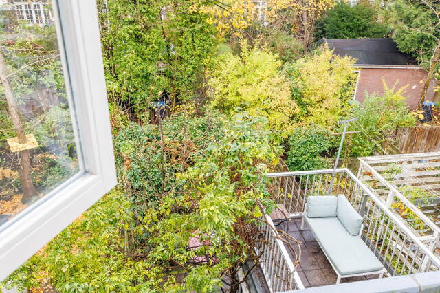 From the living room, French doors lead to the L-shaped backyard. This lovely garden (NW-facing) offers ample space for both dining and lounging areas. The lush planting includes a large fig tree, grapevines growing over the pergola, and wisteria. Thanks to the many trees on adjacent plots, this is a sheltered spot with plenty of shade in summer. It is a green and atmospheric urban garden that offers plenty of privacy.