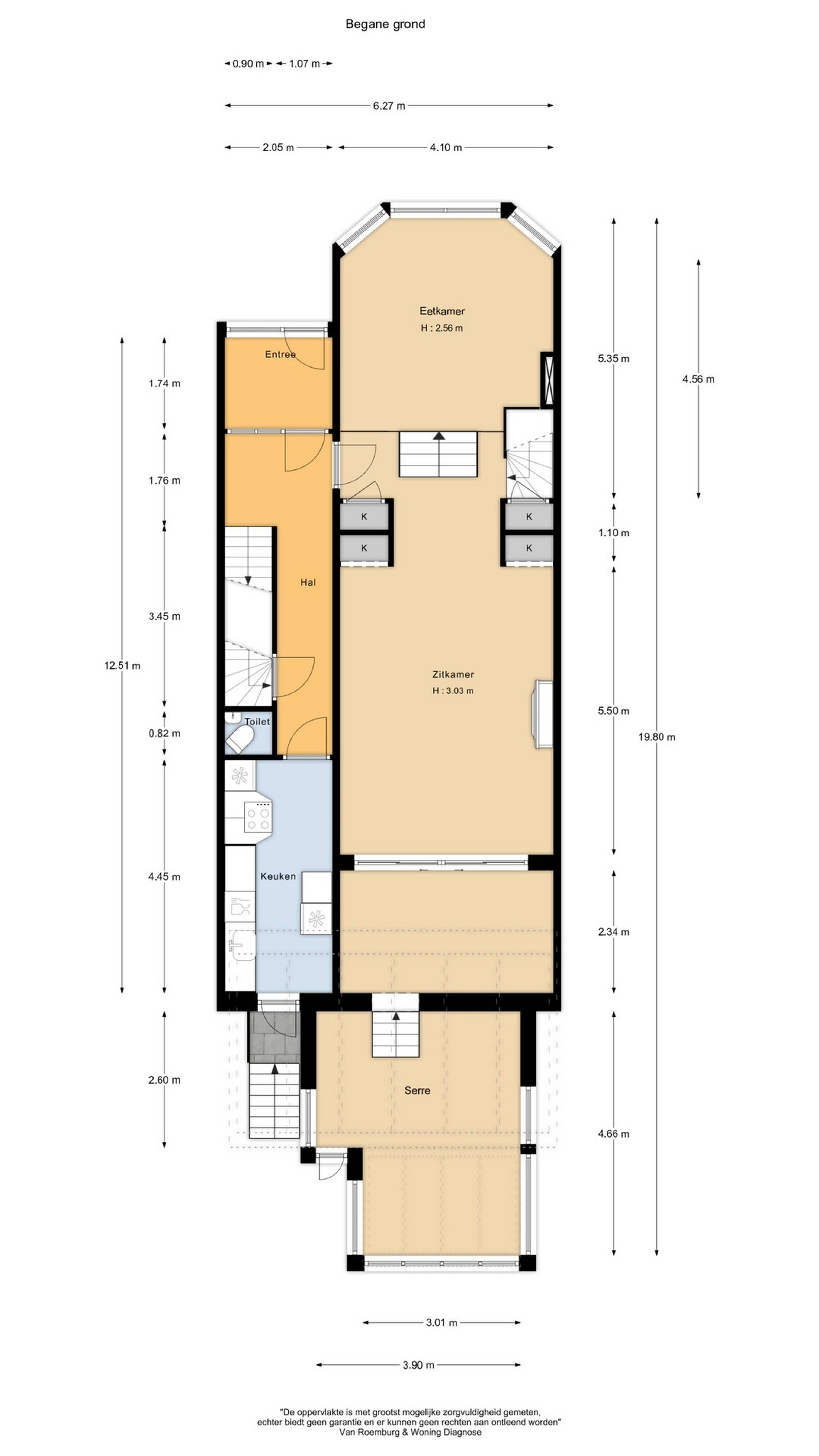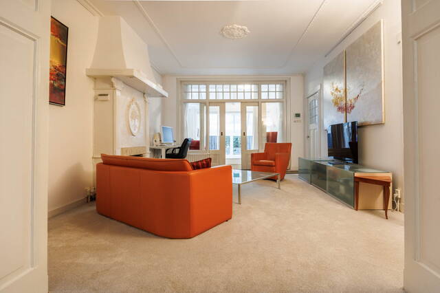 De voortuin biedt toegang tot de entree. Vanuit de vestibule kom je in de royale hal, die toegang geeft tot de woonkamer, zitkamer, keuken, het toilet, de kelder en de trap naar de eerste verdieping. De woonkamer is uitgevoerd in split-level en kenmerkt zich door meerdere niveauverschillen. Aan de voorzijde bevindt zich het eetgedeelte met een sfeervolle gashaard, originele vaste kasten en aan de zijkant een trap naar de riante kelder. In het middengedeelte van de woonkamer ligt een ruim zitgedeelte met een gezellige houthaard in een fraaie schouw. Dit deel heeft hoge plafonds met ornamenten en ook hier zijn de karakteristieke originele vaste kasten met kleine ruitjes aanwezig. Via een originele glazen wand met en-suitedeuren bereik je een tweede zitgedeelte, dat na enkele treden overgaat in de serre. Dankzij de zijlichten en dakramen is dit een heerlijk lichte, zonnige ruimte met prachtig uitzicht op de tuin. Via dubbele schuifdeuren heb je direct toegang tot de fantastische tuin. De gesloten keuken is tevens vanuit de woonkamer te bereiken en beschikt over diverse inbouwapparatuur o.a. een inductiekookplaat , een vaatwasser, een koelkast en een afzuigkap. Ook vanuit de keuken is er toegang tot de tuin.