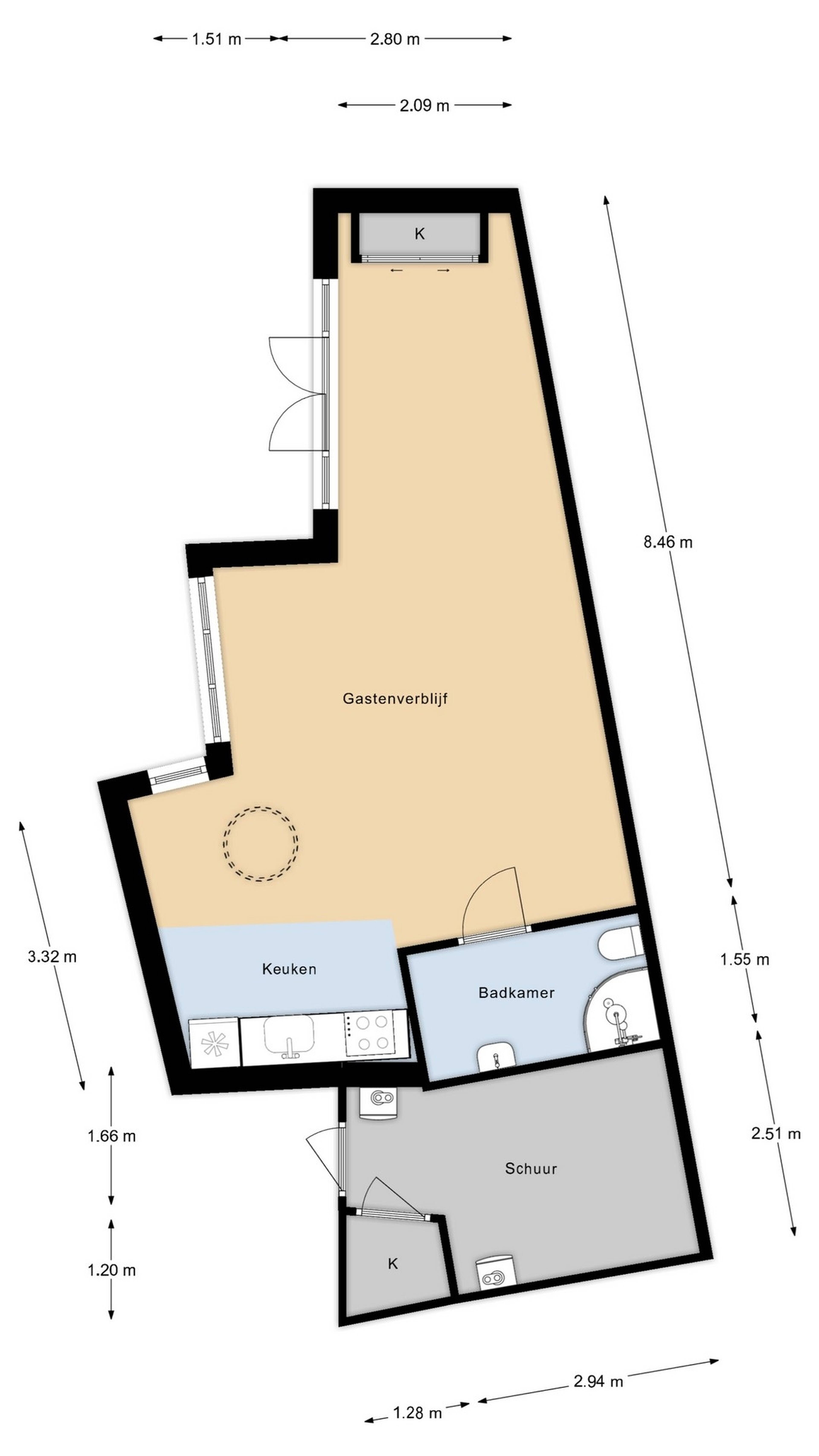 Het moderne tuinhuis beschikt over een ruime L-vormige living met open keuken, voorzien van onder andere een inductiekookplaat, vaatwasser, koel-vriescombinatie en bovenkasten met geïntegreerde afzuigkap. De badkamer is uitgerust met een inloopdouche, wastafelmeubel, toilet (verbrander) en extra bergruimte. Dankzij de ronde lichtkoepel in het dak en de grote raampartijen is dit een aangename, lichte en zonnige ruimte met veel gebruiksmogelijkheden, mede doordat het tuinhuis via de achterom bereikbaar is. Het tuinhuis is voorzien van vloerverwarming, gevoed door een warmtepomp, en beschikt daarnaast over een boiler en cv-ketel. Achter het tuinhuis bevindt zich een technische ruimte met onder andere de warmtepomp en cv-ketel, evenals extra bergruimte, bijvoorbeeld voor fietsen. Achter de woning zijn twee overdekte parkeerplaatsen aanwezig, waarvan één bij de woning hoort.