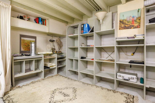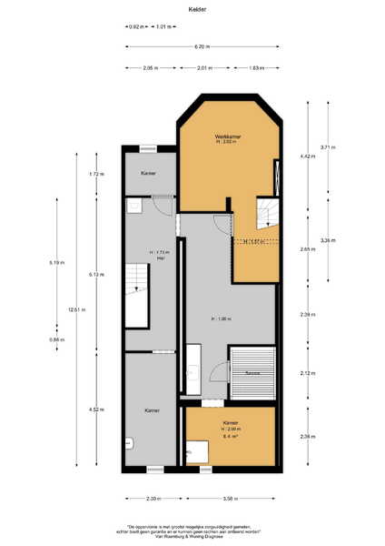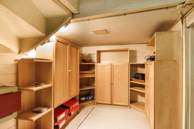 De kelder is zowel vanuit de woonkamer als de hal toegankelijk en biedt talloze mogelijkheden. Momenteel bestaat de kelder uit meerdere ruimtes, waaronder een werkkamer, een ruimte met een ingebouwde sauna en een keukenblok, een kamer met een douchecabine, een hobbyruimte met wastafel en een aparte ruimte met de wasopstelling. De hoogte van de ruimtes varieert; sommige zijn circa 2 meter hoog, terwijl andere iets lager zijn.