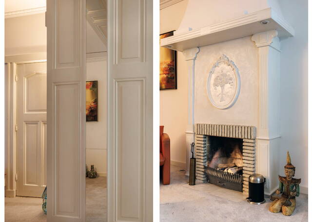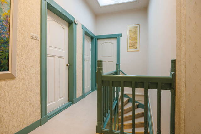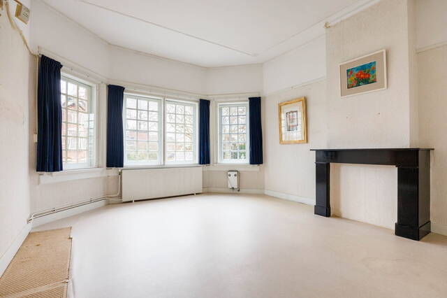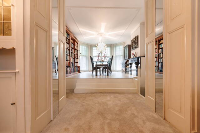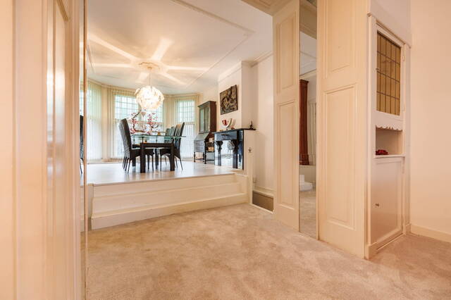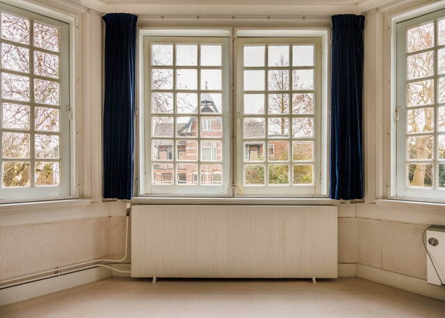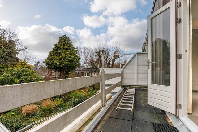 Royale overloop met dakraam en vaste kast. Aan de voorzijde bevindt zich een ruime en sfeervolle slaapkamer met een vaste kast en een schouw (niet in gebruik). Ook hier zorgen het hoge plafond met ornamenten en de fraaie originele ramen voor veel karakter. Aan de achterzijde ligt een comfortabele slaapkamer met aangrenzend een ruimte die uitstekend kan dienen als walk-in closet. Via openslaande deuren is er toegang tot het grote, op het westen gelegen balkon met een prachtig uitzicht over de tuin en de groene omgeving.