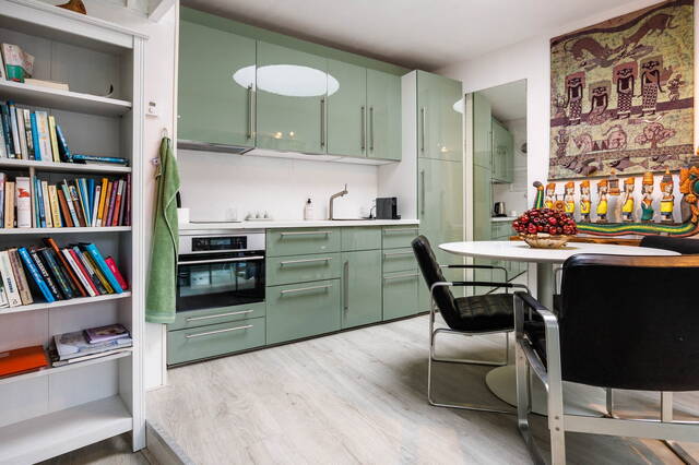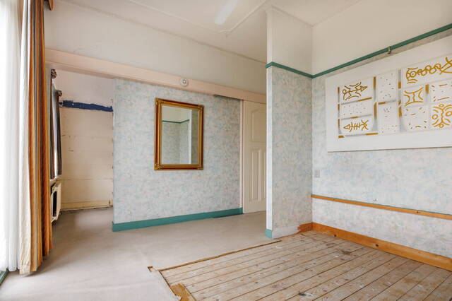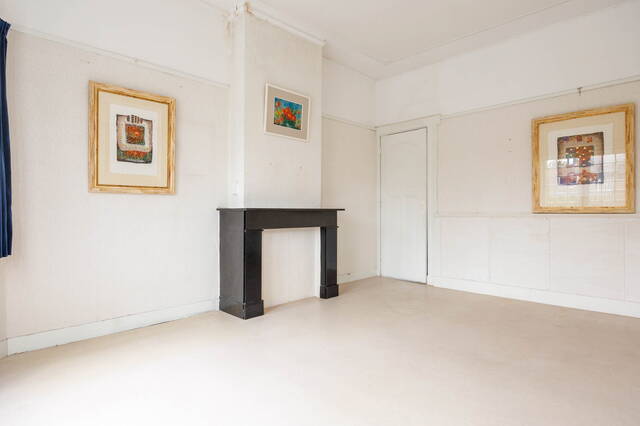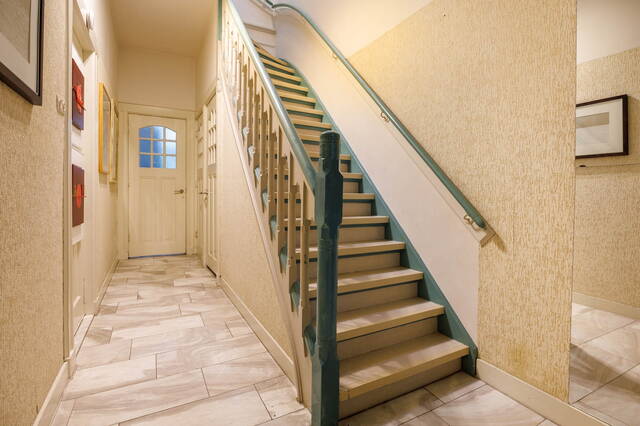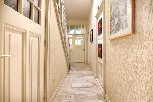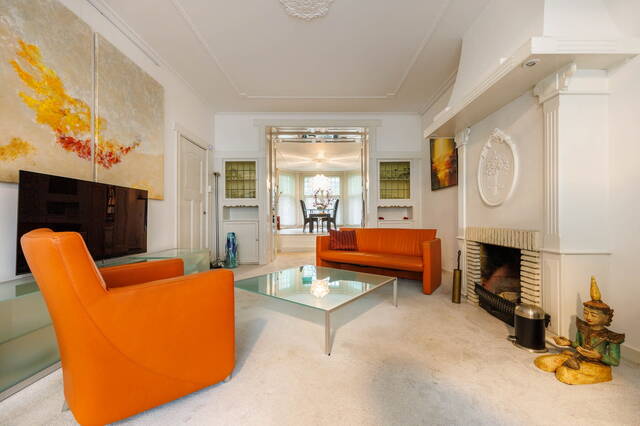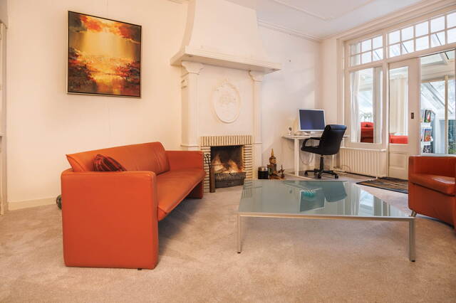 Front garden leads to the entrance. From the vestibule, you enter the spacious hall with access to the living room, sitting room, kitchen, toilet, cellar, and stairs to the first floor. The split-level living room has multiple levels, a dining area with gas fireplace, original built-in cupboards, and a staircase to the cellar. The central seating area features a wood-burning fireplace, high ceilings with ornaments, and original details. Through an original glass wall with en-suite doors, you reach a second seating area that steps into the conservatory. Large windows and skylights create a bright, sunny space with garden views. The closed kitchen is accessible from the living room and is equipped with appliances including an induction hob, dishwasher, refrigerator, and extractor. It also has garden access.