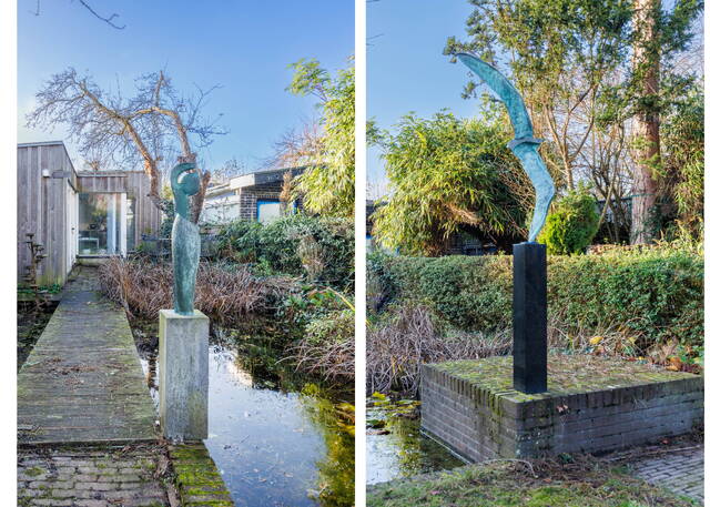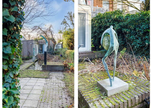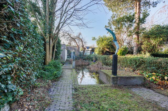 De fraai aangelegde achtertuin van circa 315 m² ligt op het westen en is speels ingedeeld met meerdere zones en vijvers. In het voorste gedeelte bevinden zich een terras, een gazon en een vijver. Via een pad bereik je het tweede deel van de tuin, waar eerst een groot terras ligt, gevolgd door een bruggetje naar het achterste gedeelte met het fraaie tuinhuis (ca. 42 m²). Overal in de tuin vind je prachtige beelden. Deze blijven achter met uitzondering van het beeld van de grote vogel bij de vijver bij de woning en het beeld van de vogel in het midden van de tuin.