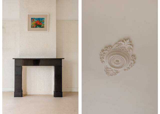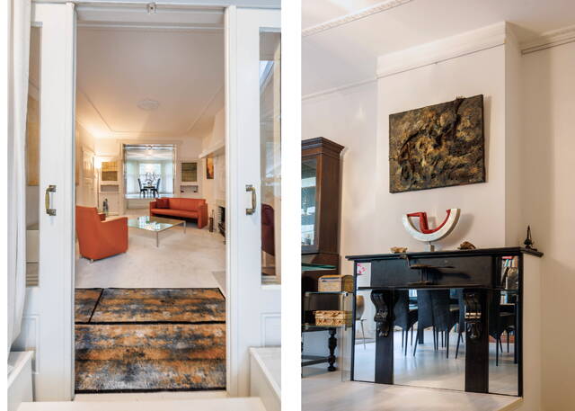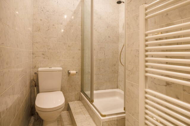 Spacious landing with skylight and built-in cupboard. Front bedroom with built-in cupboard and fireplace, high ceilings, and original windows. Rear bedroom with adjoining walk-in closet and doors to a large west-facing balcony with garden and greenery views. Direct access to the main bathroom with corner jacuzzi, walk-in shower, toilet, bidet, radiator, and vanity. Second bathroom off the landing with shower, toilet, radiator, and vanity.
