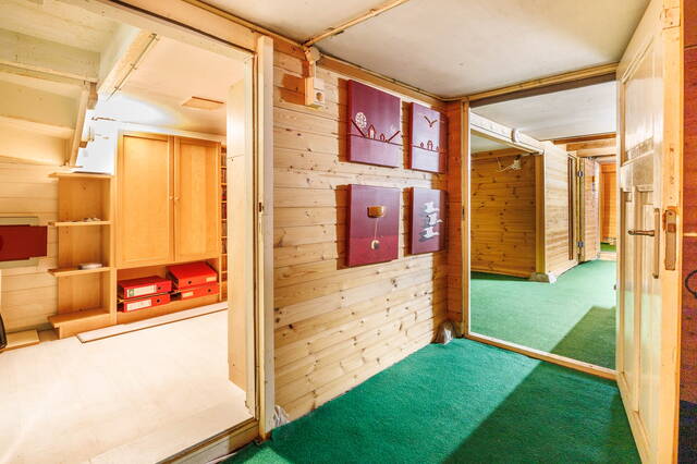 Accessible from the living room and hall, comprising multiple rooms including a study, sauna with kitchen unit, shower room, hobby room with sink, and laundry area. Ceiling heights vary between approx. 2 m and slightly lower.