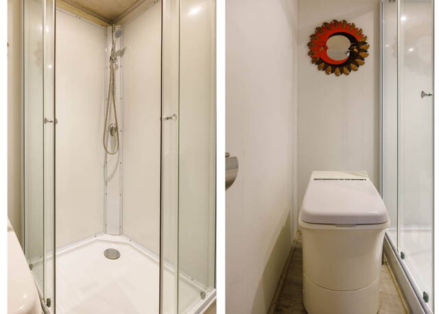 The modern garden house offers a spacious L-shaped living area with open kitchen, including induction hob, dishwasher, fridge-freezer, and overhead cupboards with integrated extractor. The bathroom has a walk-in shower, vanity, toilet, and extra storage. A skylight and large windows make the space bright and versatile, with rear access. The garden house has underfloor heating via a heat pump, plus a boiler and central heating. Behind it is a technical/utility room with additional storage. Two covered parking spaces are located at the rear, one belonging to the property.