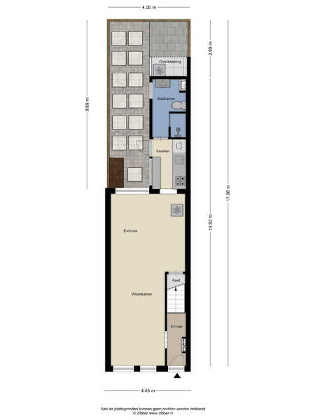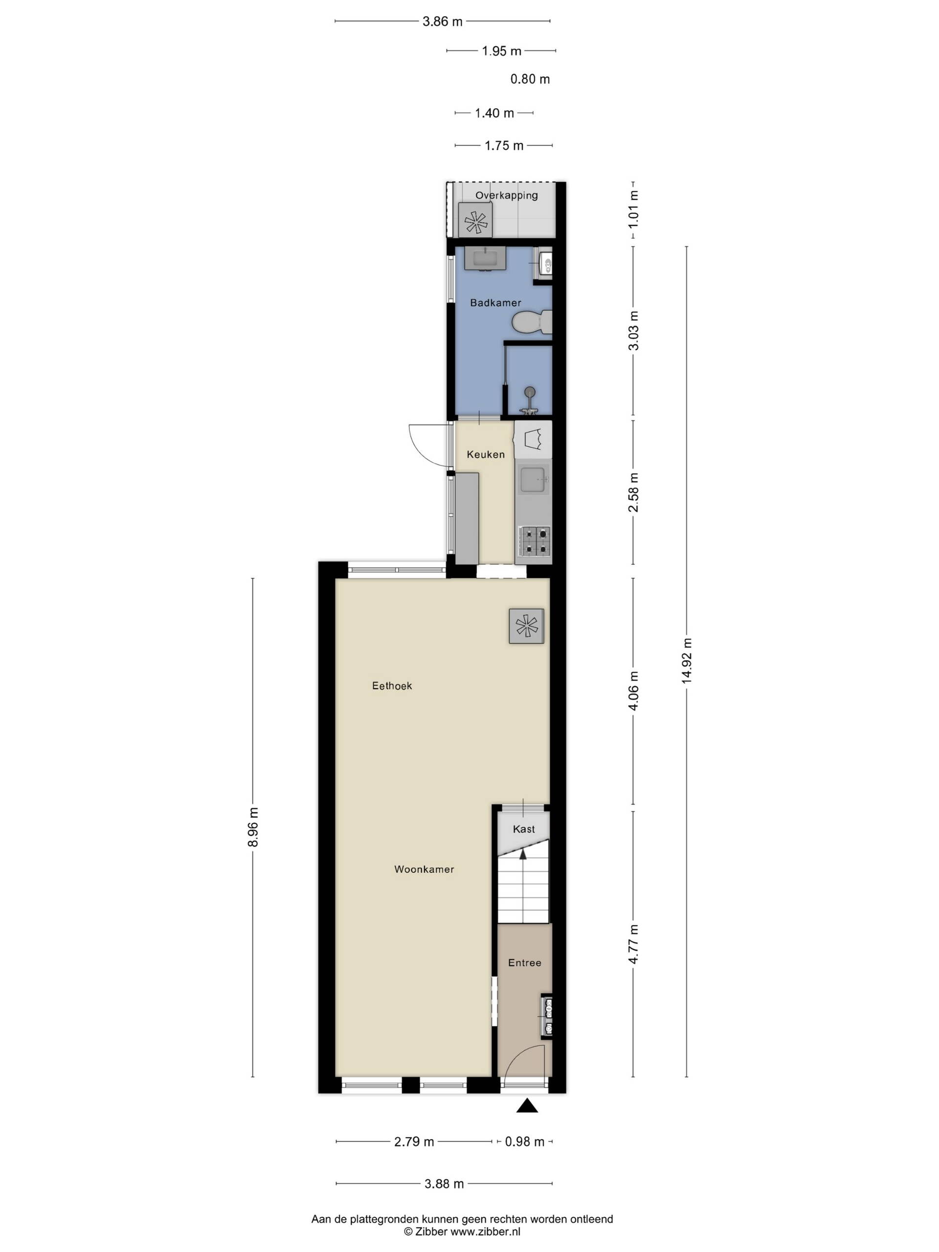 Aan de achterzijde bevindt zich de keuken, die in directe verbinding staat met de tuin. Aansluitend ligt de badkamer, voorzien van douche, wastafel en toilet.