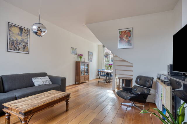 The generous living room is a particularly pleasant and bright living space, enhanced by the high ceilings and large windows that provide beautiful natural light throughout the day. This creates an open and spacious atmosphere. The warm robinia wood flooring and the attractive fireplace emphasise the character of the property and give the living room an inviting, authentic feel.