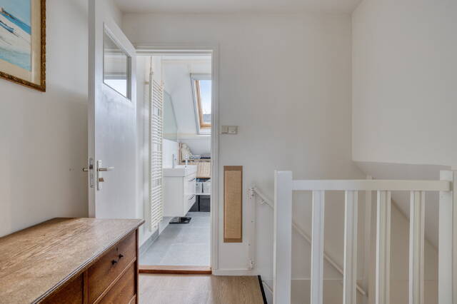 At the front of the house are the second bedroom and the neat, fully fitted bathroom. The bathroom is equipped with a separate shower, double washbasin, a second toilet (sanibroyeur) and connections for a washing machine and dryer. The second bedroom is light and cosy, thanks to a small dormer window and a Velux roof window that provide additional daylight.