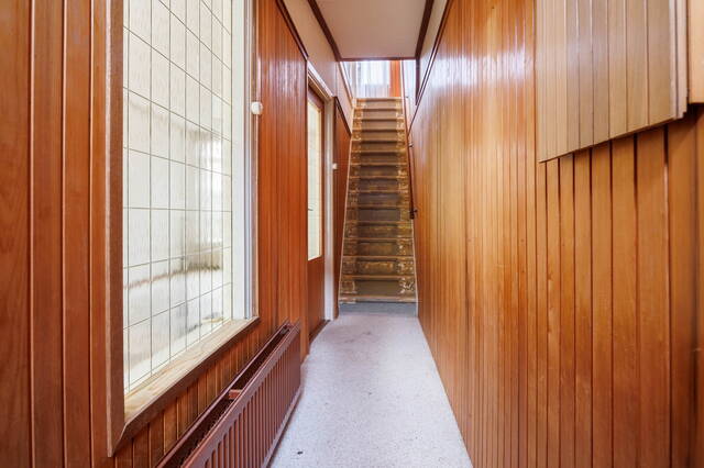 Entree. Royale hal met meterkast, trapopgang naar de eerste verdieping en toegang tot de woonkamer. De lichte en zonnige woonkamer beschikt over een karakteristieke erker, een praktische trapkast en aan de achterzijde nog originele glas-in-loodramen.