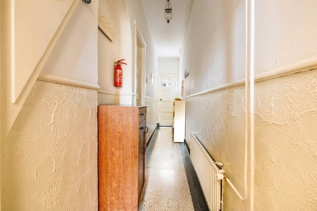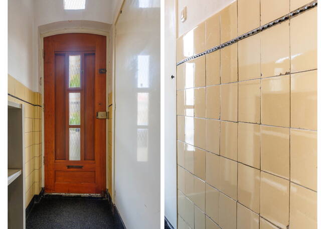 Authentic entrance. Vestibule with meter cupboard and original wall tiles. Followed by a hallway with a staircase to the first floor, featuring an original granito floor and enamel wall paneling. Access to a toilet, also with an authentic granito floor. Adjacent is a simple, enclosed kitchen with a door leading to the pleasant backyard.