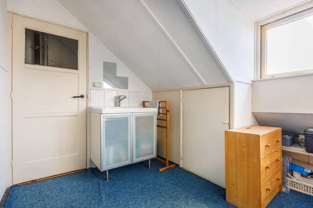 Landing with washing machine setup and central heating boiler, and access to a spacious rear bedroom with a dormer window, built-in (sliding) wardrobe, and ample storage space behind the knee walls. From this bedroom, you can access the front bedroom, which features a skylight, built-in wardrobe, and additional storage behind the knee walls.