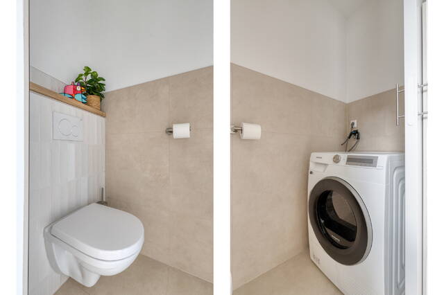 Entree in de hal met meterkast en trapopgang. De doorzonwoonkamer beslaat de volledige lengte van de woning en kenmerkt zich door een prettige lichtinval via de ramen aan voor- en zijkant. De visgraat PVC-vloer met vloerverwarming zorgt voor een comfortabele en moderne basis. Aan de voorzijde is ruimte voor een zitgedeelte, terwijl aan de achterzijde een eethoek in verbinding staat met de keuken. De open keuken is voorzien van moderne inbouwapparatuur en praktische bergruimte. Vanuit hier is de knusse, recent betegelde buitenruimte bereikbaar. Aansluitend bevindt zich het separate toilet met opstelling voor de wasmachine.