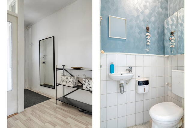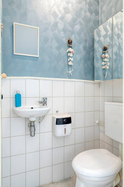 Op de vierde verdieping kom je binnen in een royale, lichte hal die toegang biedt tot de meterkast en het toilet met fonteintje.