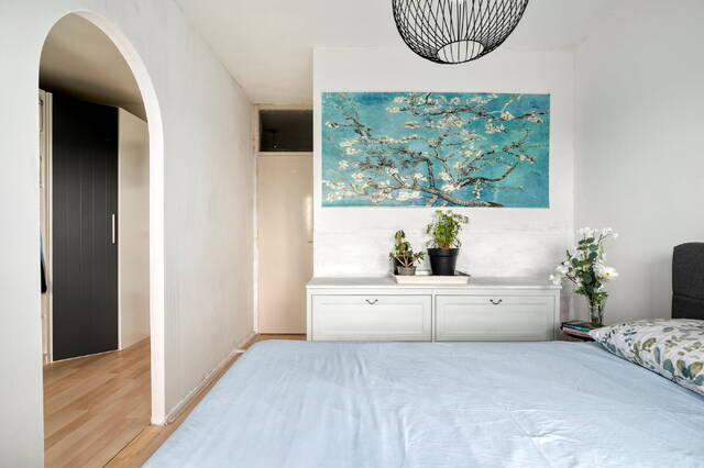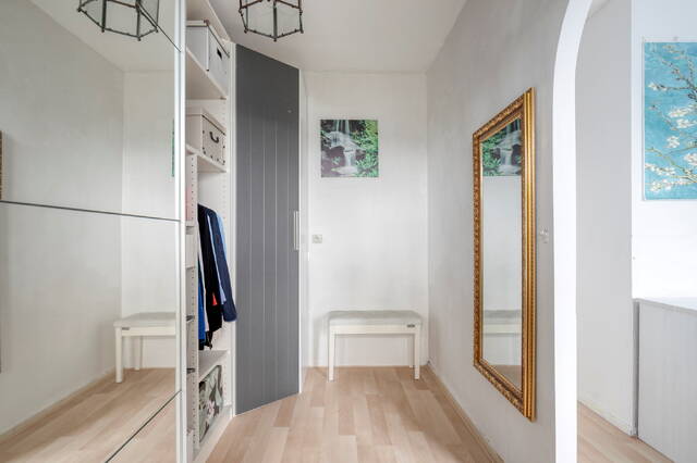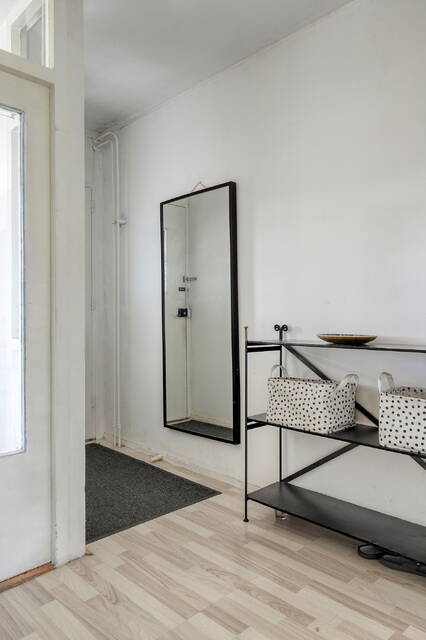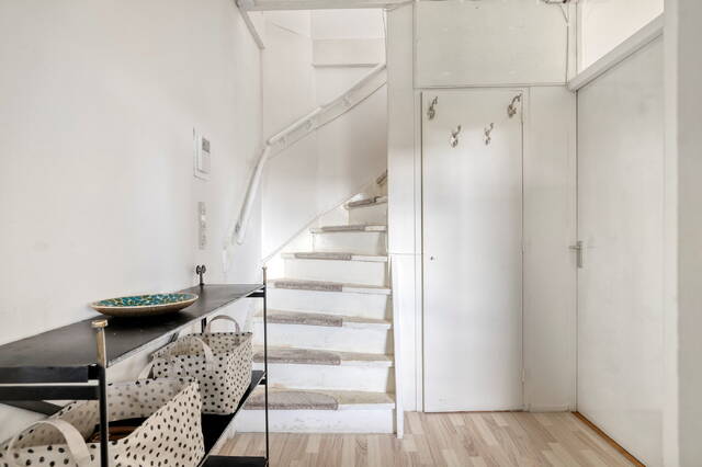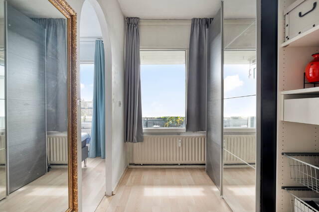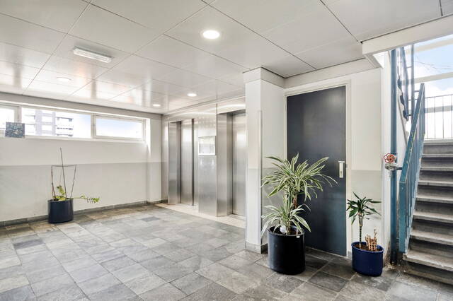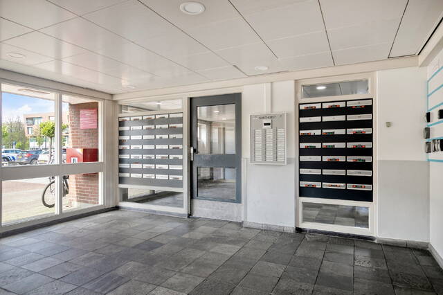 Je betreedt de woning via een ruime, afgesloten portiek met twee liften, een trapopgang en toegang tot de individuele fietsen- en bergingen. Het portiek is voorzien van een video-intercom en biedt een veilige en nette toegang tot het complex. Vanaf hier bereik je eenvoudig de vierde verdieping en stap je binnen in de hal van de woning.