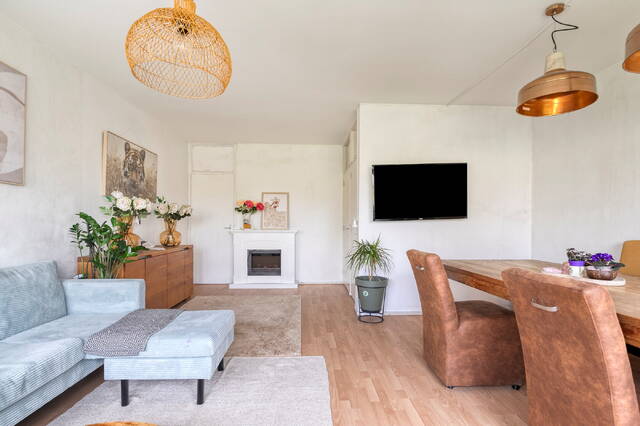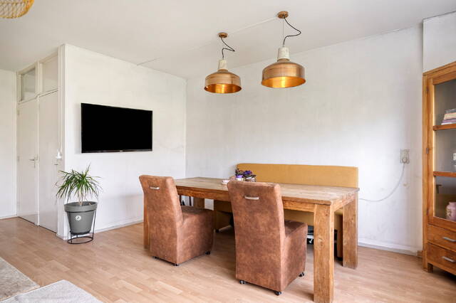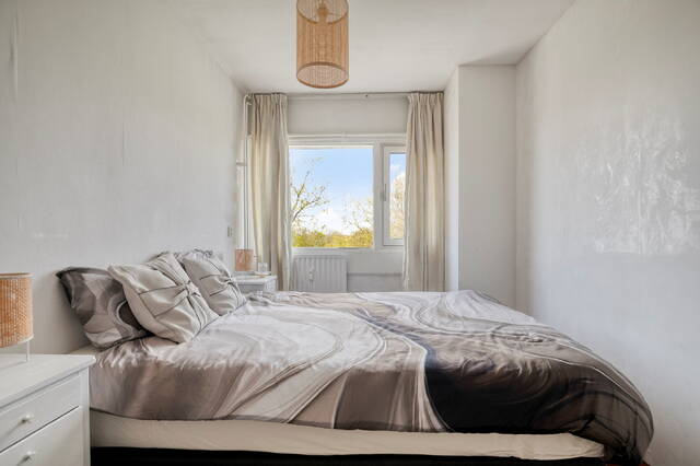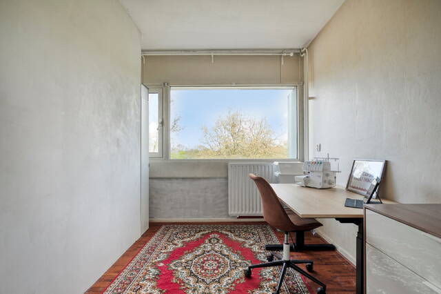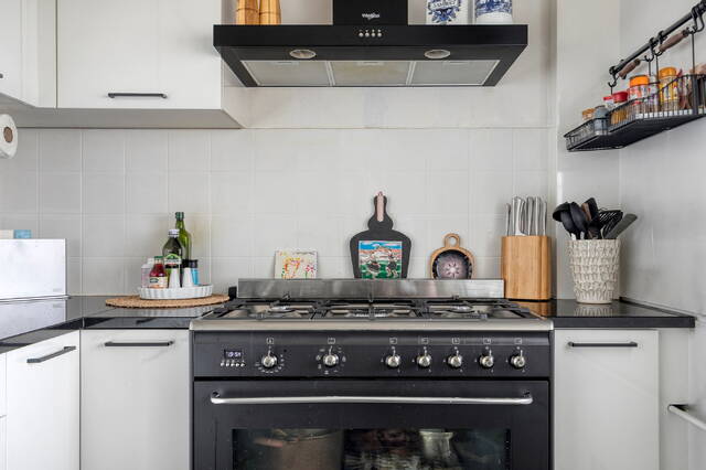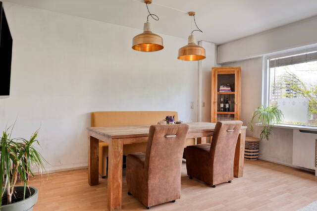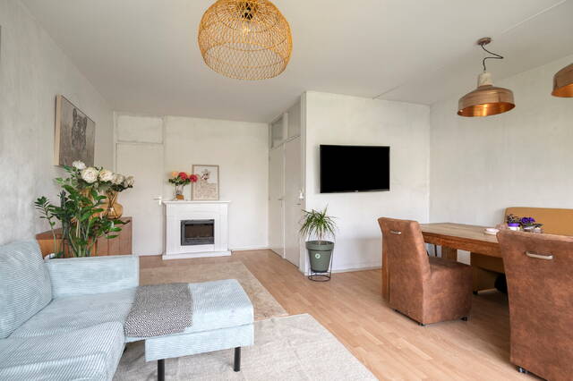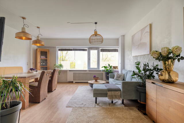 De woonkamer is ruim en licht, met een prachtig vrij uitzicht over het groene park. De ruimte wordt geaccentueerd door een mooie, lichte vloer die doorloopt in de leefruimte. Twee vaste kasten zorgen voor handige bergruimte. Direct aansluitend vind je de functionele en lichte keuken, uitgerust met een koel-vriescombinatie, vaatwasser, volop kastruimte en een mooi gasfornuis.