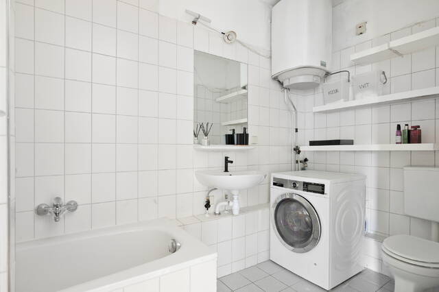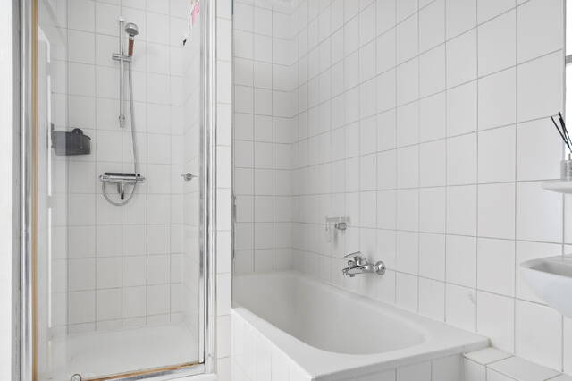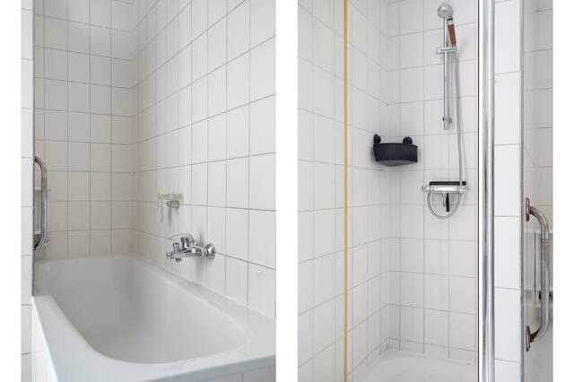 De badkamer is netjes en licht afgewerkt en beschikt over een douche, ligbad, wastafel en een tweede toilet.