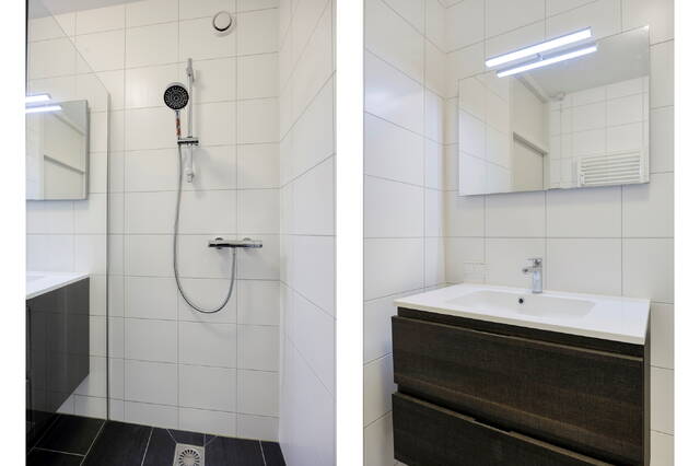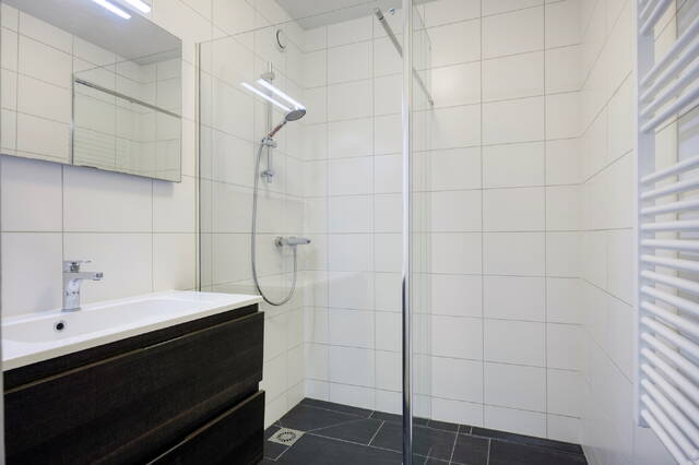 Het appartement beschikt over één ruime slaapkamer, eveneens met directe toegang tot het balkon. De moderne badkamer is voorzien van een inloopdouche, wastafelmeubel en designradiator.