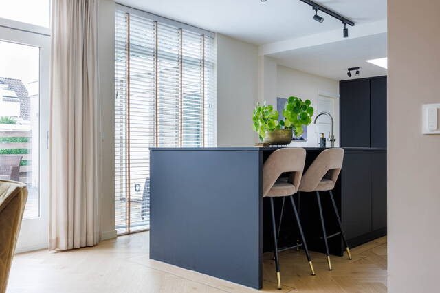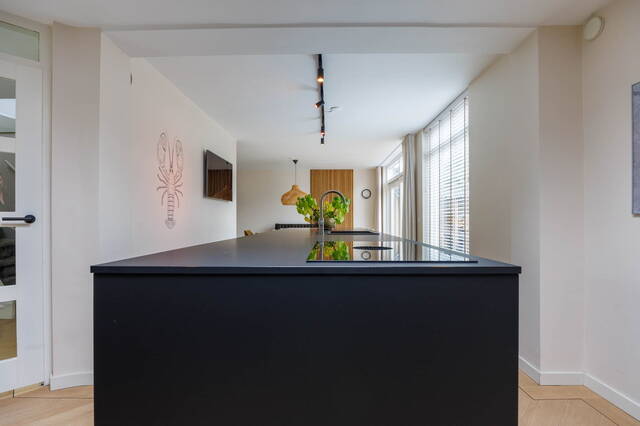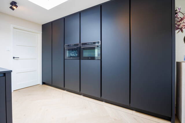 Keuken: de luxe open keuken is het hart van het huis. Uitgevoerd met een groot kookeiland, strakke matzwarte kastenwand met inbouwapparatuur (o.a. oven en combi-oven, een Quooker en een inductiekookplaat met ingebouwde afzuiging), en veel bergruimte. Dankzij de grote ramen en lichtkoepel is het een bijzonder lichte leefruimte.