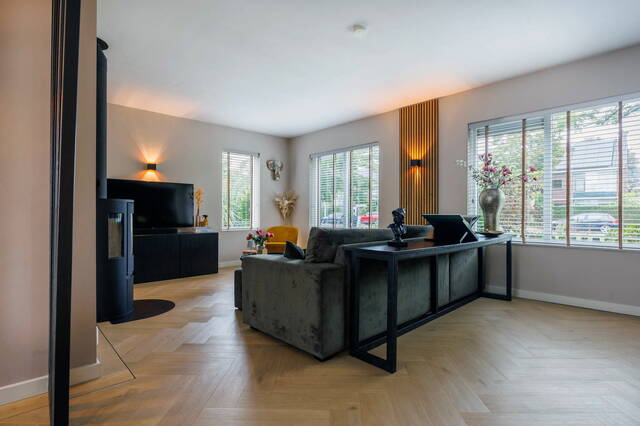 Woonkamer: een royale, lichte woonkamer met een sfeervolle houtkachel, grote raampartijen en uitzicht op de tuin. De pvc-visgraatvloer met vloerverwarming loopt door over de gehele verdieping en geeft een warme uitstraling.