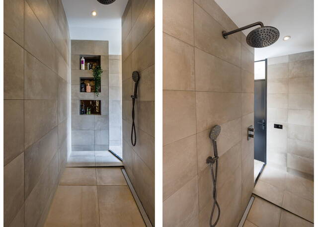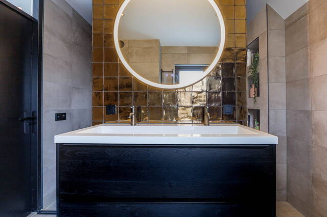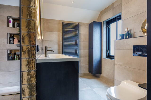 Badkamer: modern afgewerkt met een inloopdouche, wastafelmeubel en tweede toilet.