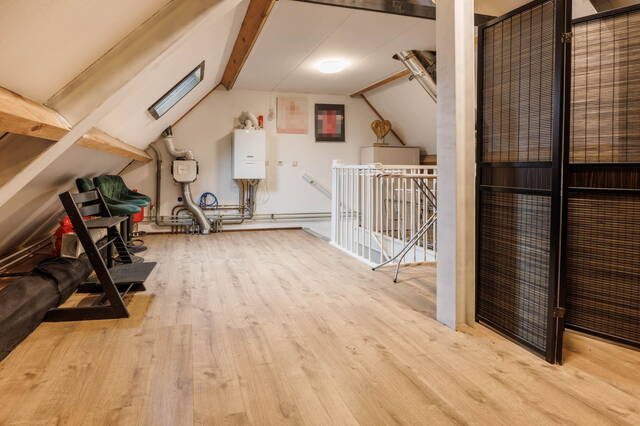 Zolder: een royale open ruimte met een nokhoogte van ruim 3 meter. Deze verdieping is naar wens in te delen als extra slaapkamer, werk- of hobbyruimte. Hier bevinden zich tevens de aansluitingen voor wasmachine en droger.