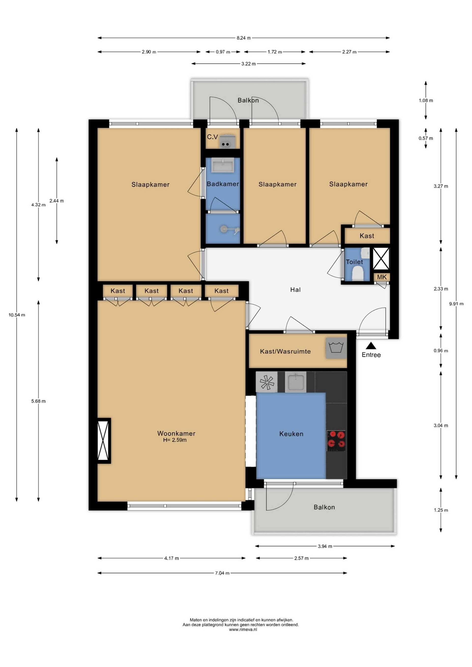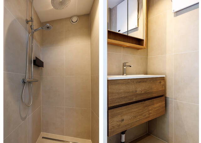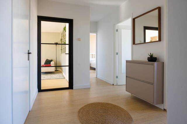 The 3 pleasant and bright (bed)rooms are located at the rear. The largest bedroom also provides access to a new bathroom with a walk-in shower with a stylish glass door and a vanity unit with mirror cabinet. From the middle room, you have access to a cozy west-facing balcony with a built-in cupboard containing the central heating boiler. The right-hand bedroom has a fixed wardrobe for extra storage space.