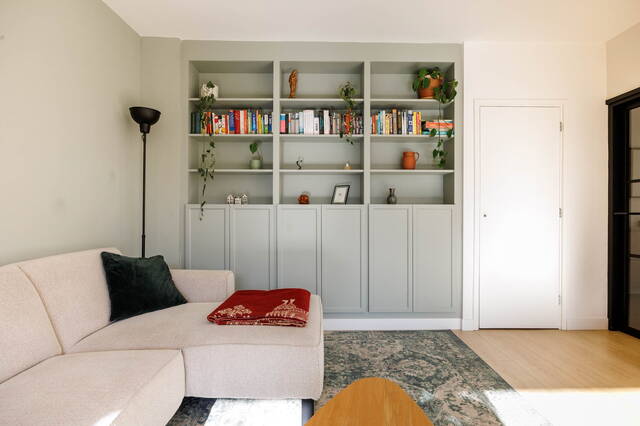 Entrance to the apartment, spacious hallway with a modern toilet with washbasin, meter cupboard, and a large storage space which also houses the washing machine/dryer setup. The sunny and spacious living room with a modern open kitchen features a beautiful custom-made wall unit. The generous kitchen is equipped with various built-in appliances, including an induction hob with integrated extraction, dishwasher, refrigerator, washing machine, and a combi-oven.