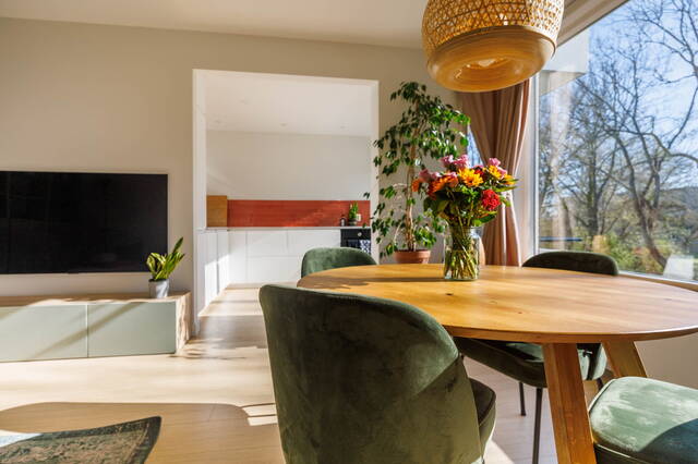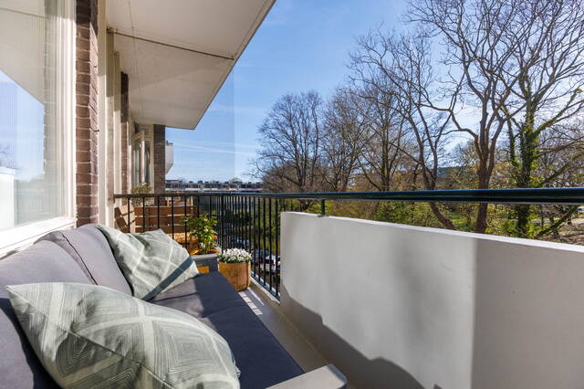 Vanuit de keuken bereik je het zonnige balkon (Oost) met heerlijk uitzicht op het park en het watertje.