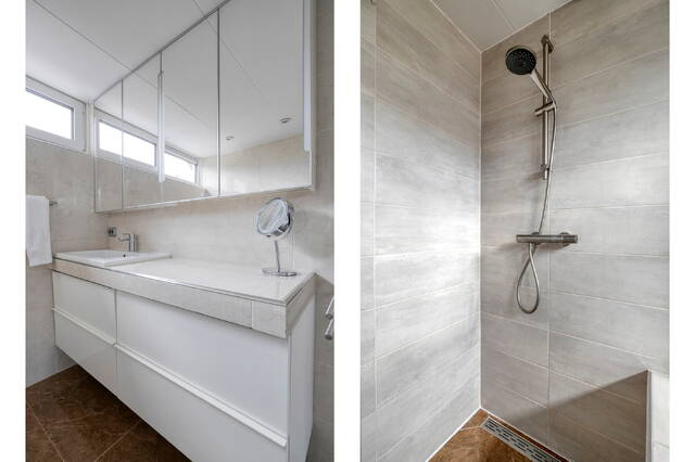The large north-facing rear garden oeers both sunny and shaded areas and is neatly landscaped with greenery and terraces. At the back of the garden is a stone shed with electricity, ideal for bicycles, tools or hobbies. The front garden is also well maintained, giving the property a welcoming appearance.