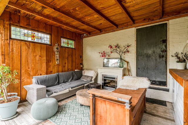 Via de ruime en zonnige voortuin bereikt u de vestibule met garderobe, meterkast en karakteristieke glas-in-loodramen. De hal geeft toegang tot het moderne toilet, een praktische trapkast en de royale woonkamer met open keuken. De uitgebouwde woonkamer van ca. 40 m² is licht en sfeervol, met een erker, strak gestuukte wanden en plafonds met subtiel lijstwerk, een mooie houten vloer en een open haard. De open keuken met fraai kookeiland vormt het hart van het huis en staat in directe verbinding met het eetgedeelte. De keuken is compleet uitgerust met onder andere een 6-pits gasfornuis met grote oven, rvs-afzuigkap, vaatwasser, koelkast, Quooker en combimagnetron.