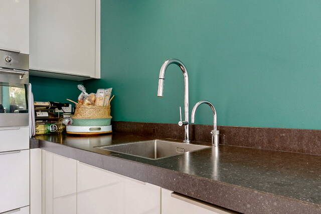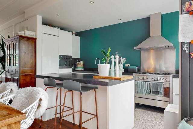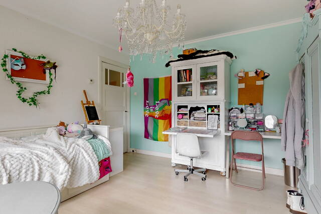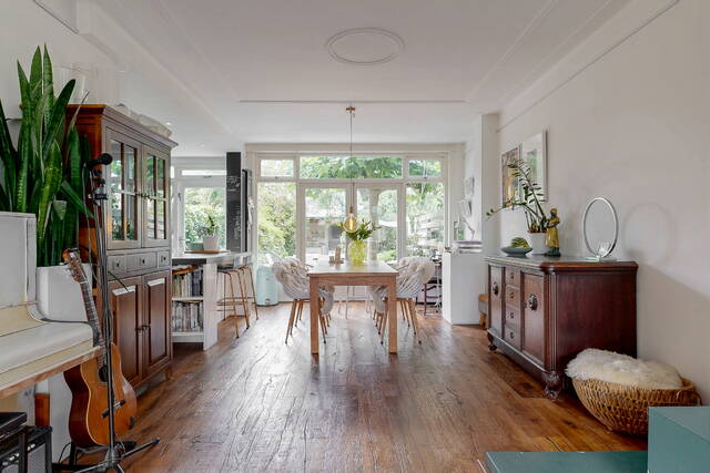 Through the spacious and sunny front garden you reach the vestibule with wardrobe, meter cupboard and characteristic stained glass windows. The hall gives access to the modern toilet, a practical stair cupboard and the spacious living room with open kitchen. The extended living room of approximately 40 m² is light and attractive, with a bay window, sleek plastered walls and ceilings with subtle mouldings, a beautiful wooden floor and a fireplace. The open kitchen with beautiful cooking island forms the heart of the house and is directly connected to the dining area. The kitchen is fully equipped with, among other things, a 6-burner gas stove with large oven, stainless steel extractor hood, dishwasher, refrigerator, Quooker and combination microwave.