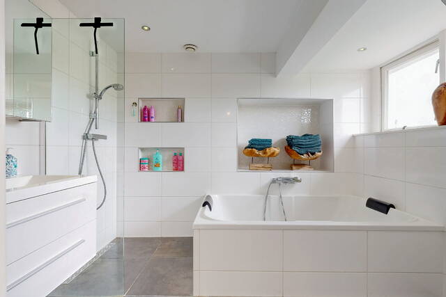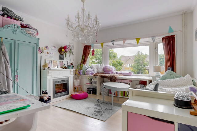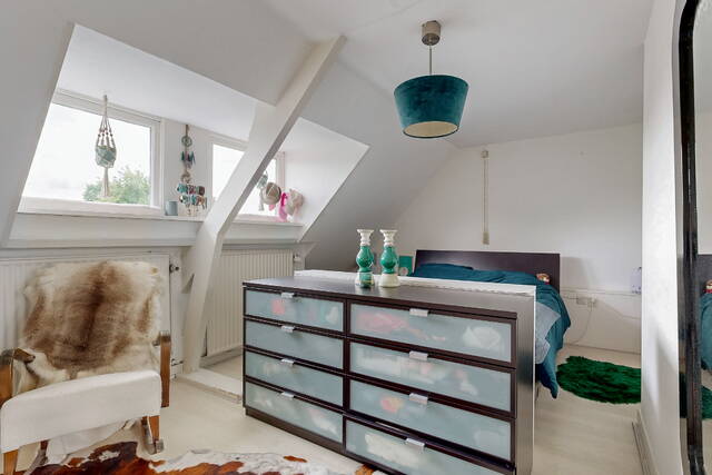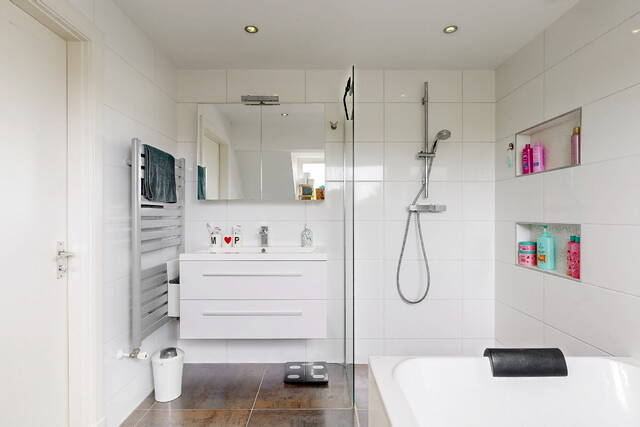 On the first floor there are two spacious bedrooms, a third (sleeping/working) room and the first bathroom. The bedroom at the rear has a closet and patio doors to a spacious balcony with a view over the garden. The bedroom at the front has a charming bay window with a wide windowsill. The luxurious bathroom has daylight and has a spacious walk-in shower, washbasin with mirror, design radiator and built-in wardrobe. The second toilet is located separately on the landing.