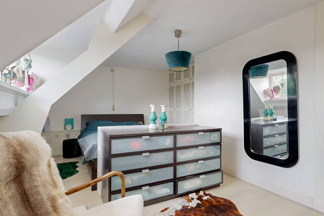 The staircase leads to a spacious landing with skylight, laundry room and a practical workplace with fixed cupboard wall. Here is also a spacious bedroom with dormer window and plenty of storage space. The second modern bathroom has daylight and is equipped with a third toilet, a spacious double bath, a walk-in shower, washbasin with mirror cabinet and design radiator. The spacious attic is accessible via a loft ladder.
