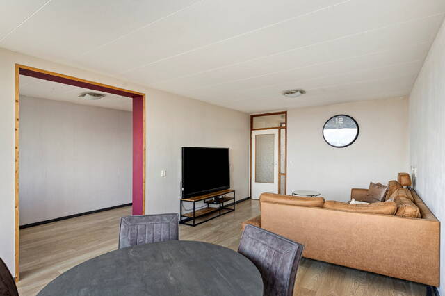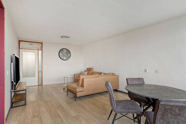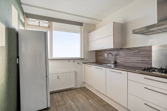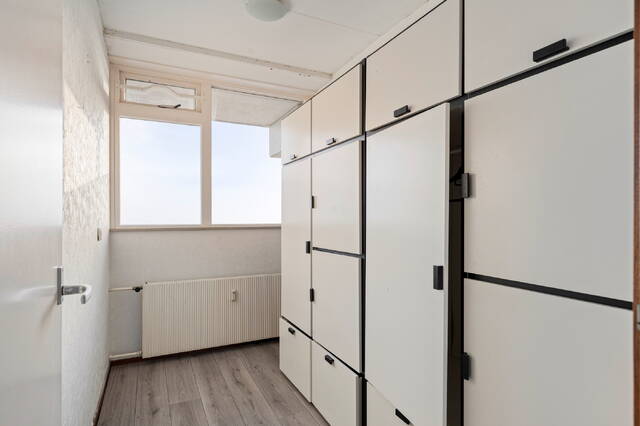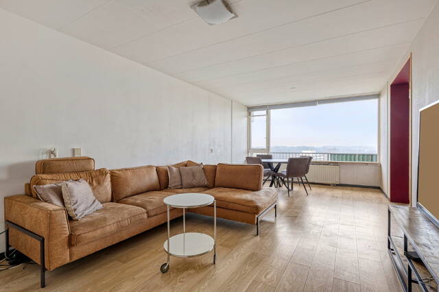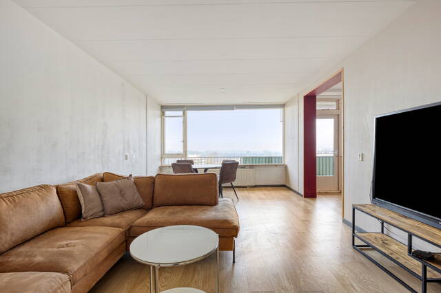 Het balkon strekt zich over de achterzijde van de woning en is toegankelijk vanuit de woonkamer, waardoor u heerlijk kunt genieten van de zon, het uitzicht en de frisse lucht. Door de ligging op de 10e etage ervaart u een gevoel van ruimte en vrijheid, met een schitterend panorama over de stad en het omliggende groen.
