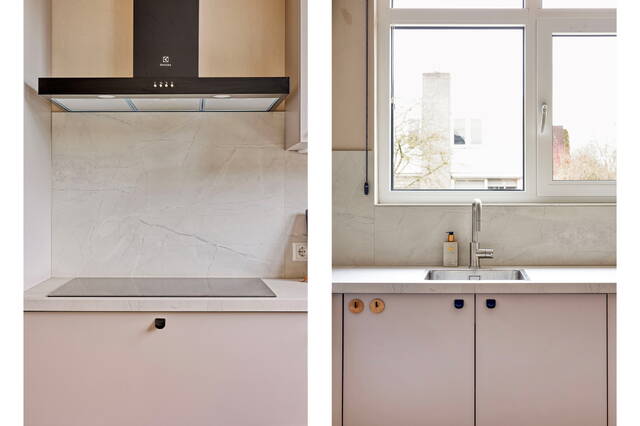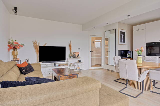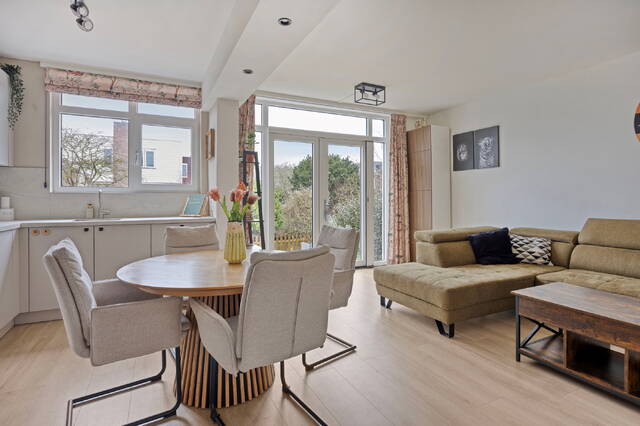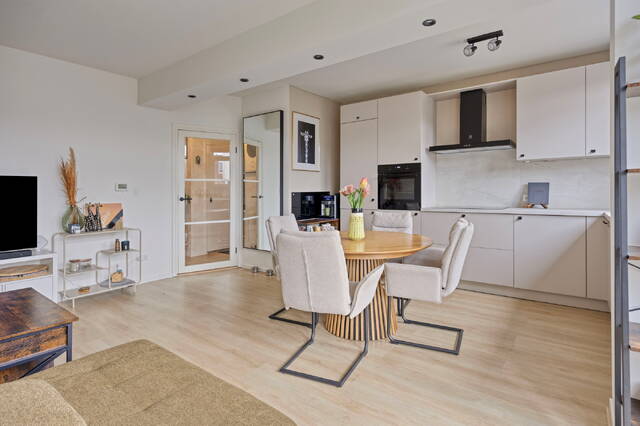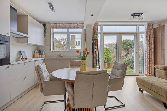 Aan de achterzijde van de woning ligt de lichte, tuingerichte woonkamer met laminaatvloer en openslaande deuren naar de zonnige achtertuin aan het water. De open keuken is uitgerust met moderne apparatuur, zoals een inductiekookplaat, afzuigkap, koel-/vriescombinatie en vaatwasser. Door de vele ramen is er volop natuurlijk licht, waardoor een prettige ruimte ontstaat voor zowel een gezellige zithoek als een ruime eettafel.