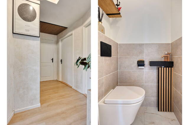 Via de verzorgde voortuin met eigen parkeerplaatsen bereik je de entree van deze instapklare benedenwoning. Vanaf de hal heb je toegang tot alle vertrekken. Hier bevinden zich de moderne meterkast, het stijlvolle toilet met fonteintje en een handige garderobe. De CV-ketel is netjes weggewerkt.